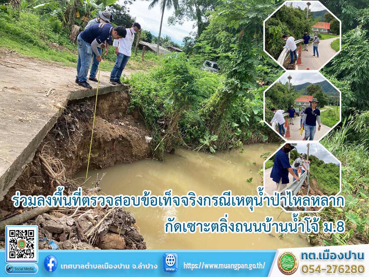 งานป้องกันฯ และกองช่าง เทศบาลตำบลเมืองปาน ร่วมลงพื้นที่ตรวจสอบข้อเท็จจริงกรณีเหตุน้ำป่าไหลหลากกัดเซาะตลิ่งถนนบ้านน้ำโจ้ ม.8 เพื่อพิจารณาดำเนินการช่วยเหลือต่อไป