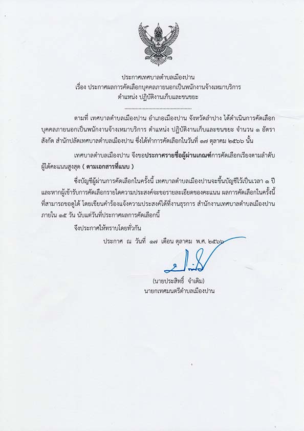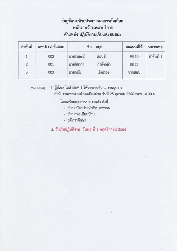 🟢 โดยให้ผู้ที่สอบได้ลำดับที่ 1 ให้รายงานตัว ณ งานธุรการ สำนักงานเทศบาลตำบลเมืองปาน วันที่ 25 ตุลาคม 2566 เวลา 10.00 น. 🟢