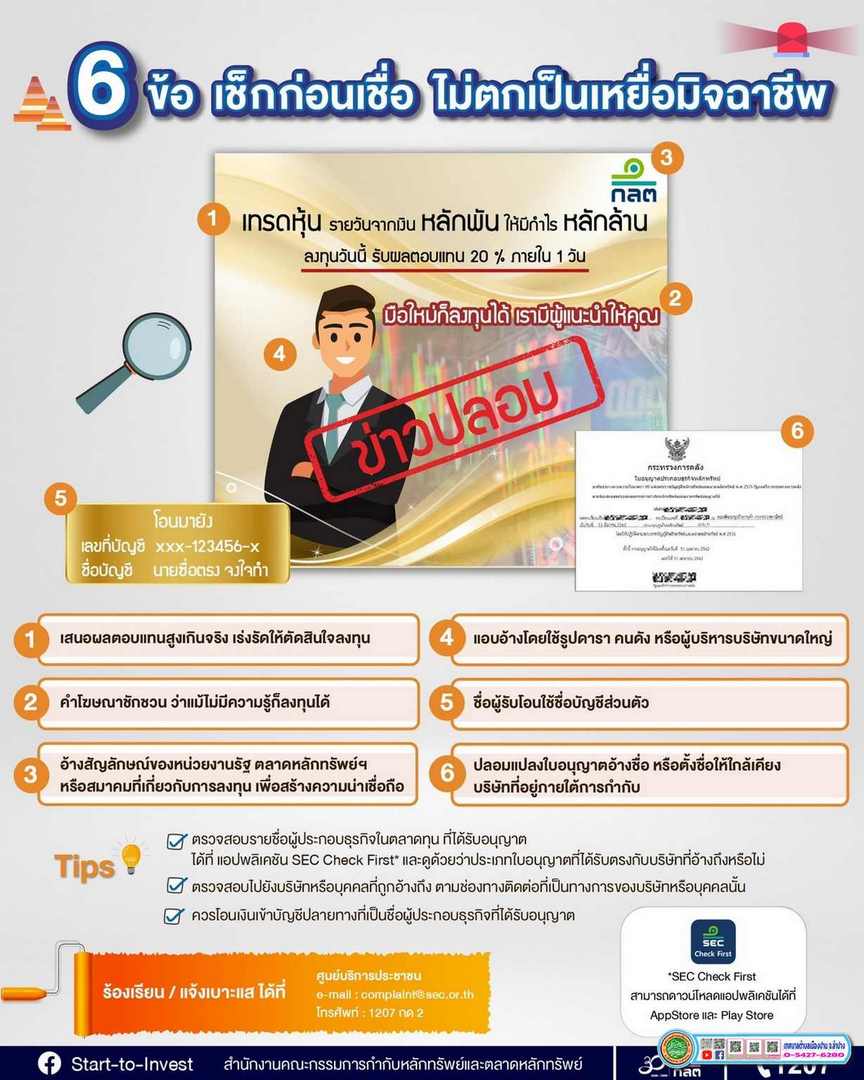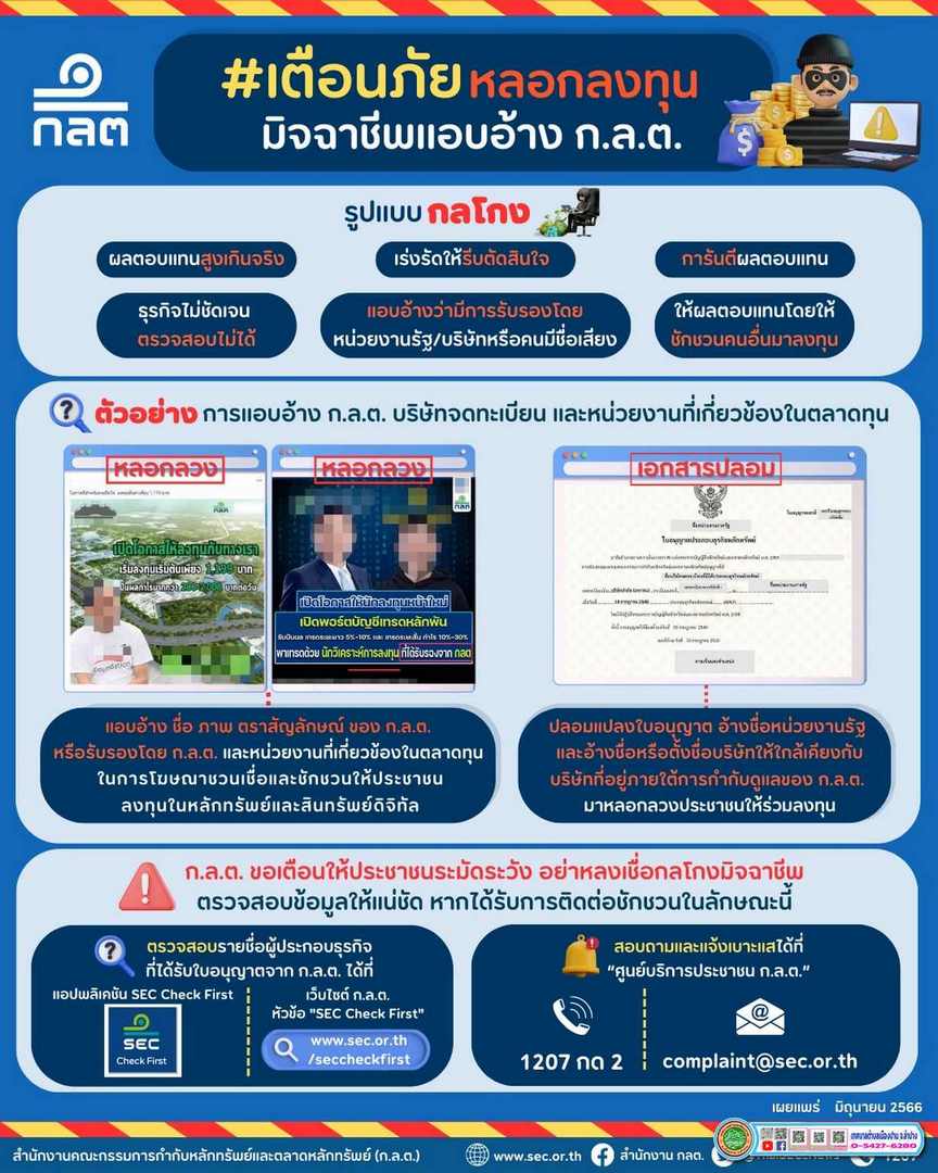 🔶 เตือนภัยหลอกลงทุน มิจฉาชีพแอบอ้าง (ก.ล.ต.)