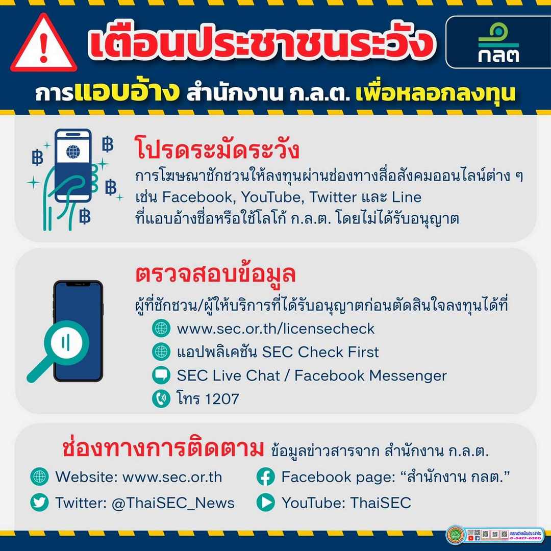 ประชาสัมพันธ์เตือนภัยประชาชนจากสำนักงานคณะกรรมการกำกับหลักทรัพย์และตลาดหลักทรัพย์ (ก.ล.ต.)