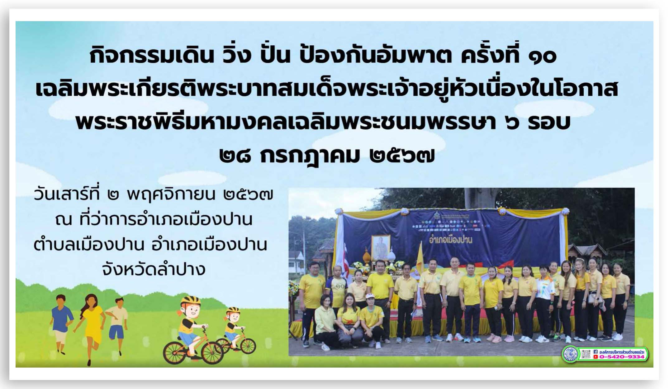 🙏🔸วันเสาร์ที่ ๒ พฤศจิกายน ๒๕๖๗ เวลา 06.30 น. เทศบาลตำบลเมืองปานร่วมกิจกรรม "เดิน วิ่ง ปั่น ป้องกันอัมพาต ครั้งที่ ๑๐ เฉลิมพระเกียรติพระบาทสมเด็จพระเจ้าอยู่หัวเนื่องในโอกาสพระราชพิธีมหามงคลเฉลิมพระชนมพรรษา ๖ รอบ ๒๘ กรกฎาคม ๒๕๖๗" ณ บริเวณศูนย์ราชการที่ว่าการอำเภอเมืองปานตำบลเมืองปาน อำเภอเมืองปาน จังหวัดลำปาง 🚶🏃♀️🚲
