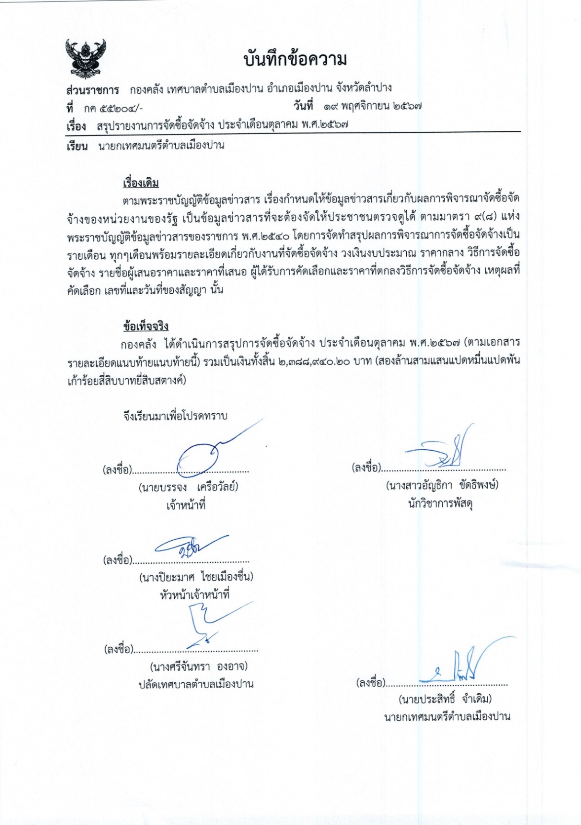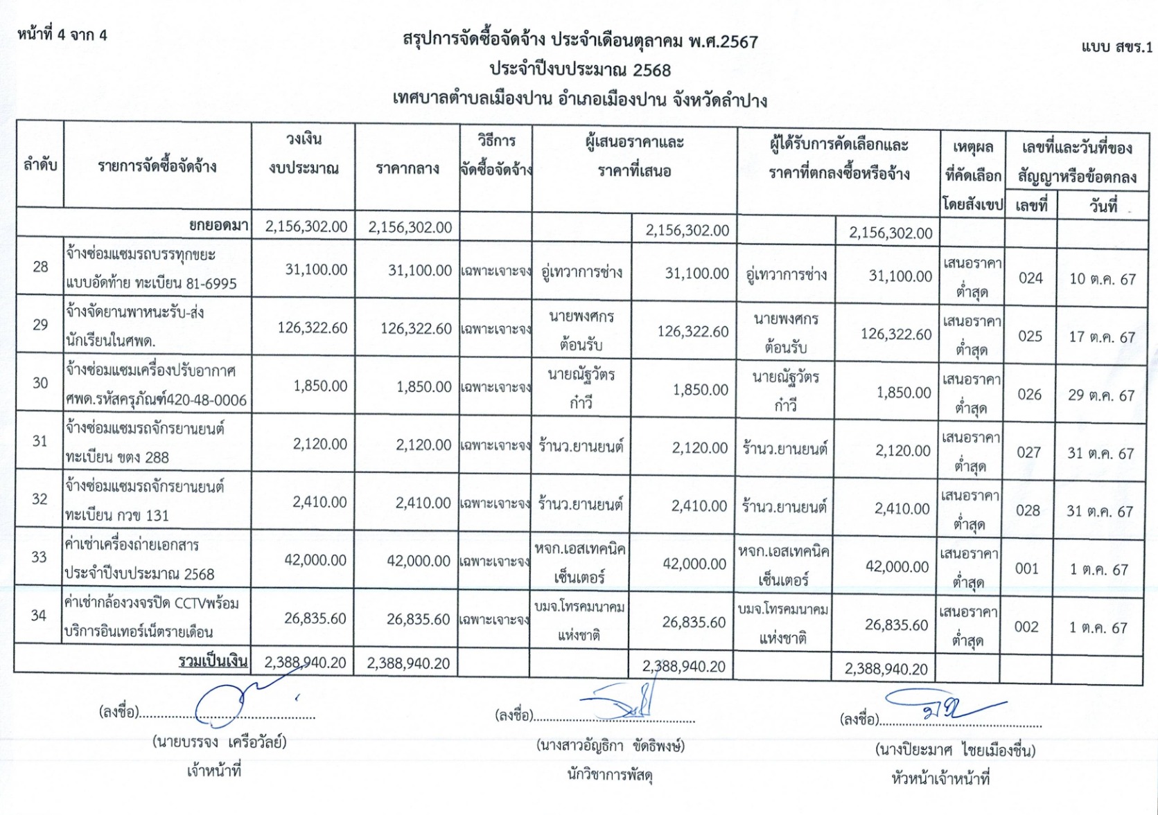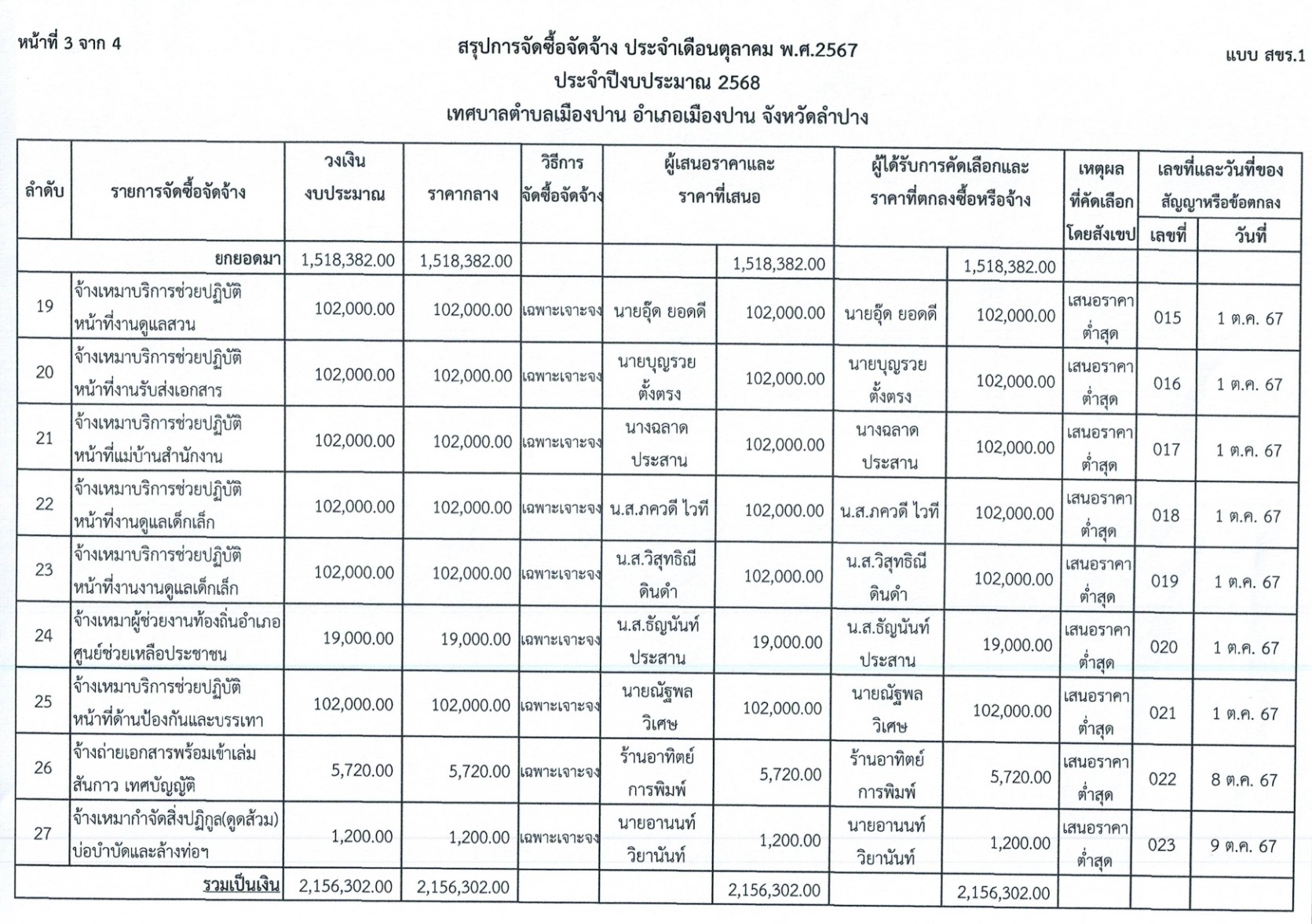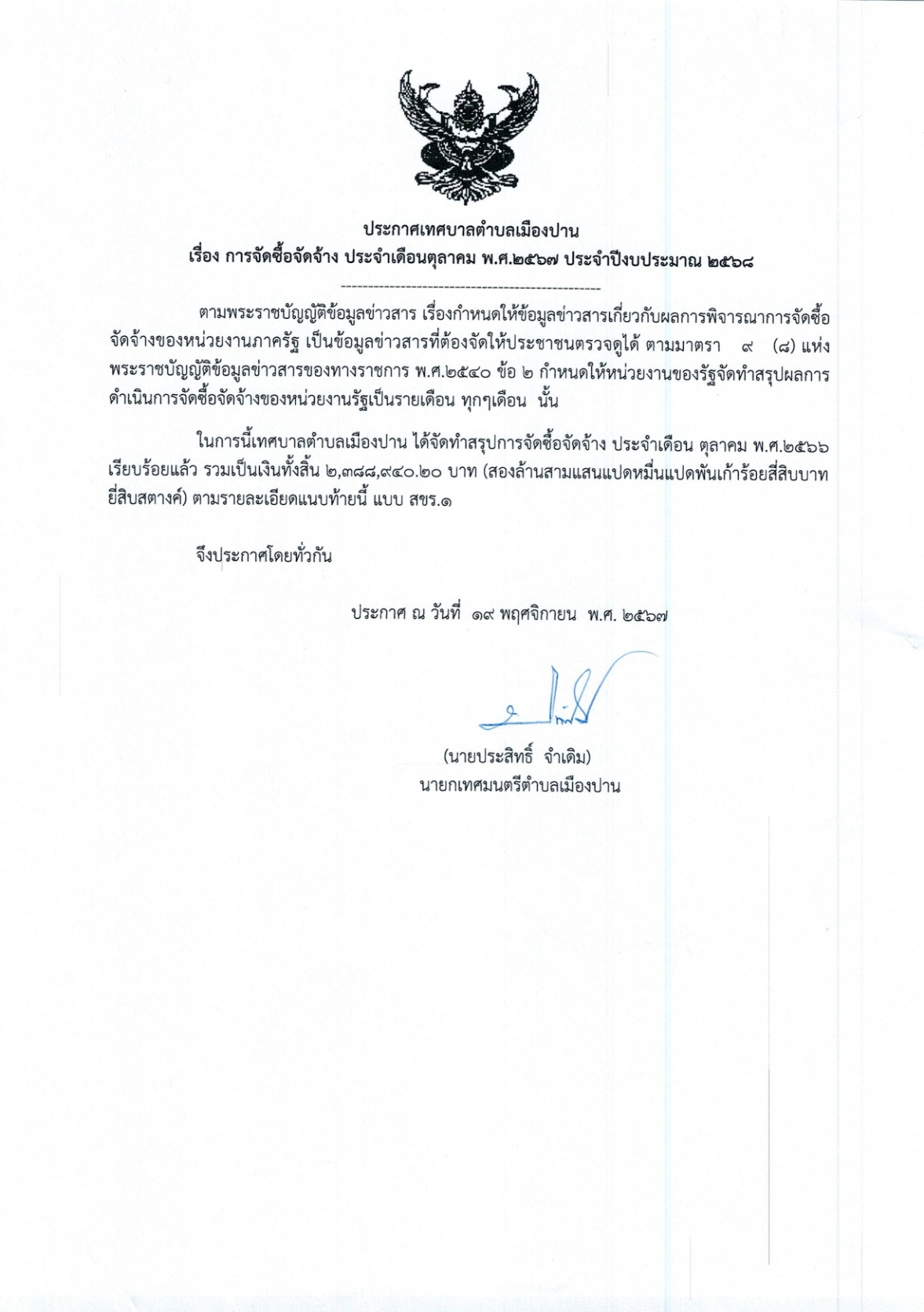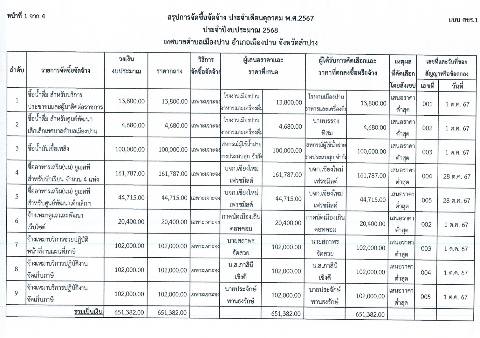 การจัดซื้อจัดจ้าง ประจำเดือนตุลาคม พ.ศ.๒๕๖๗ ประจำปีงบประมาณ ๒๕๖๘