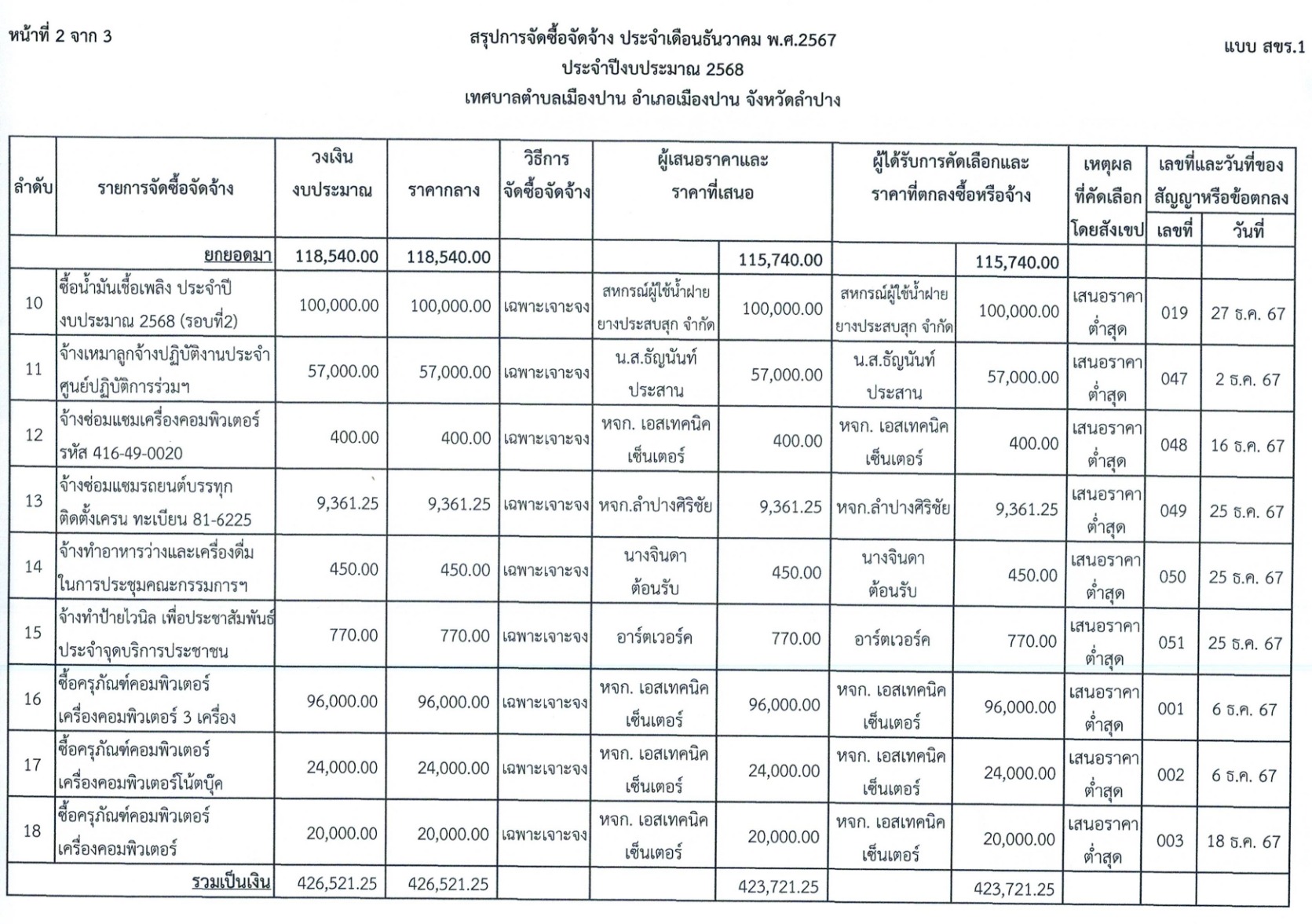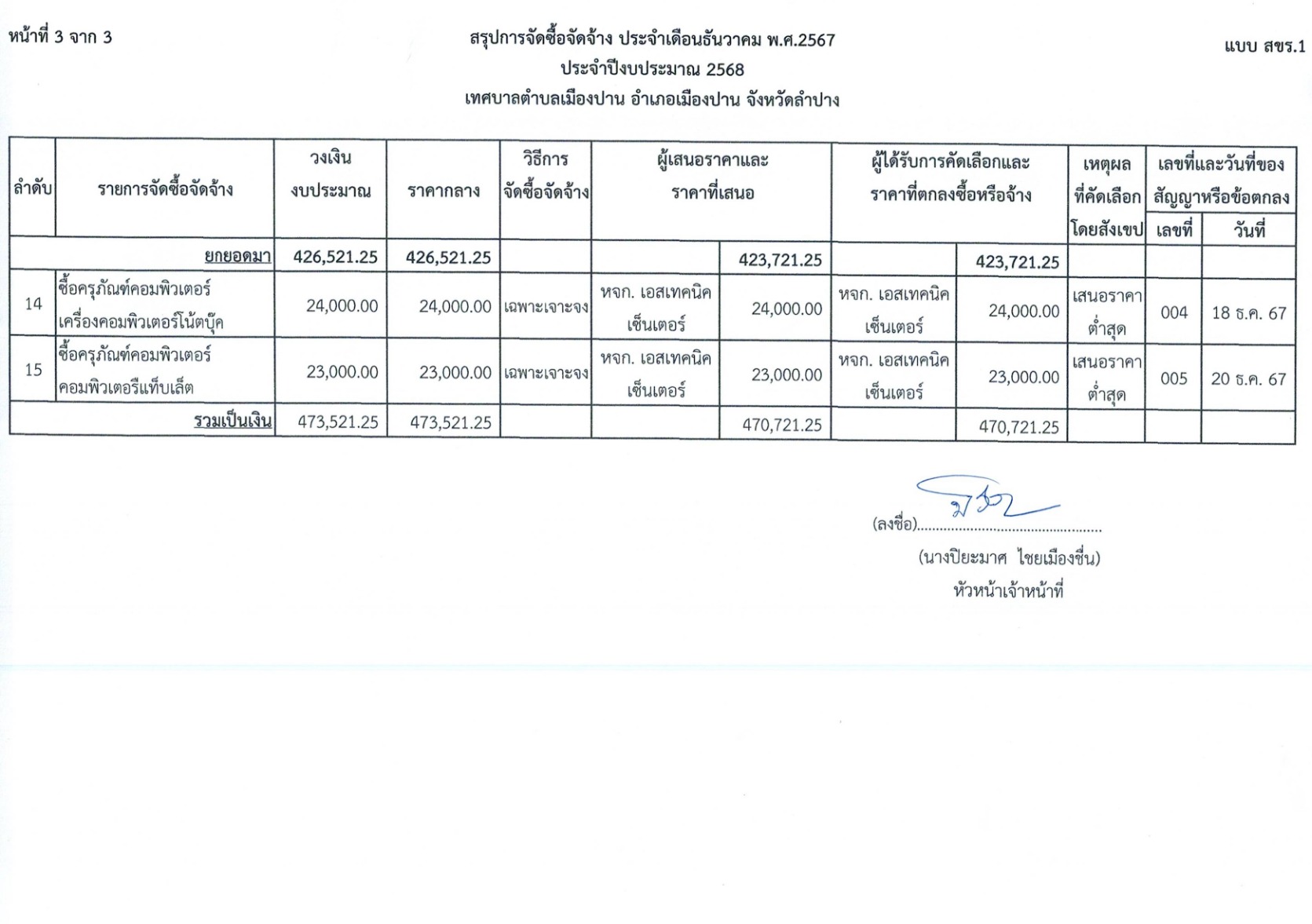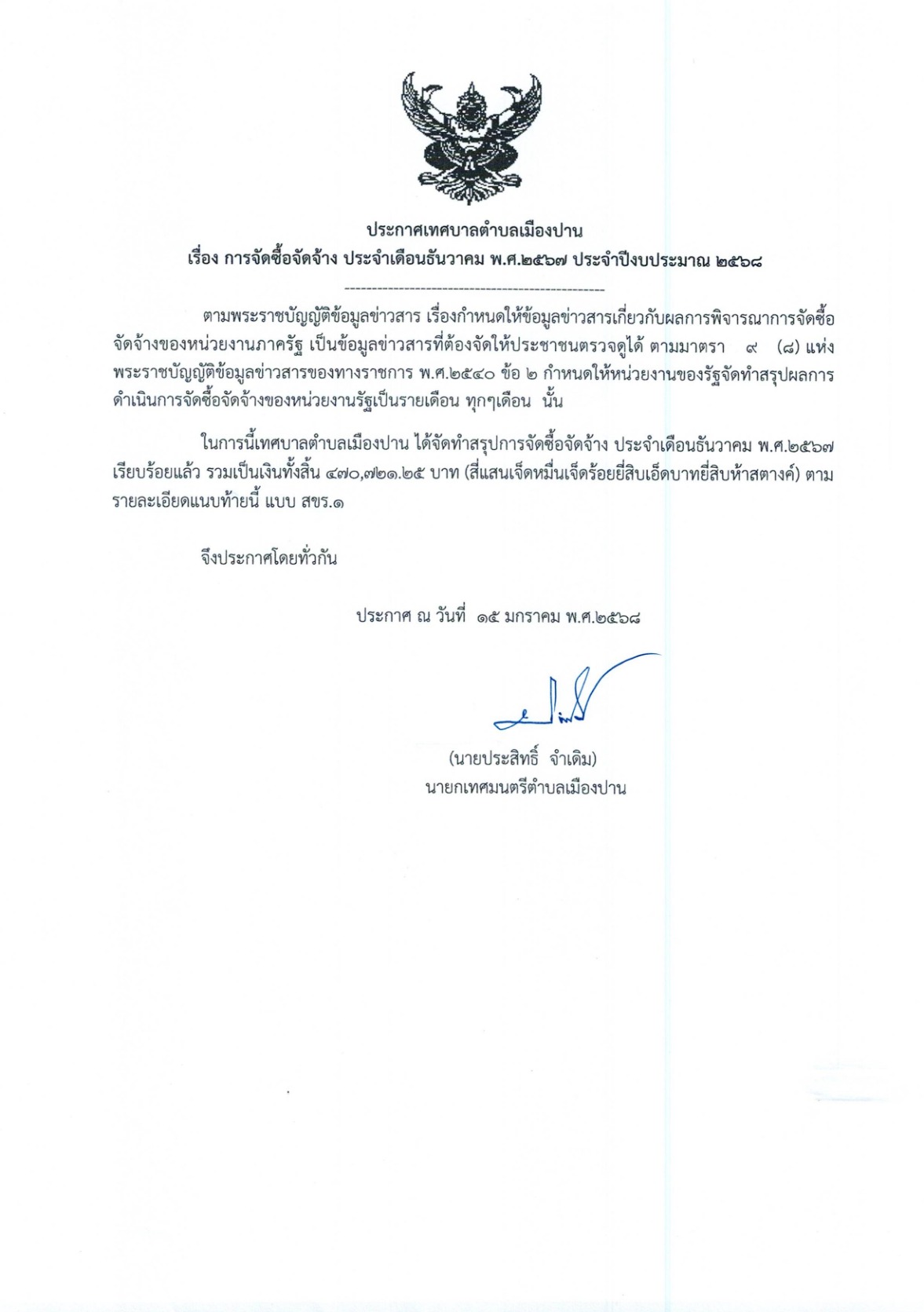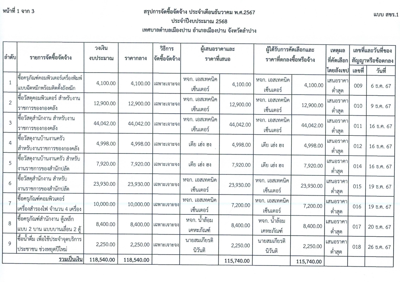 การจัดซื้อจัดจ้าง ประจำเดือนธันวาคม พ.ศ.๒๕๖๗ ประจำปีงบประมาณ ๒๕๖๘