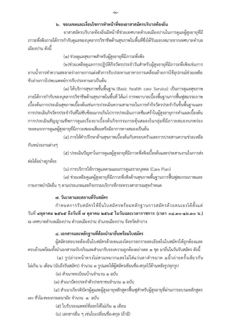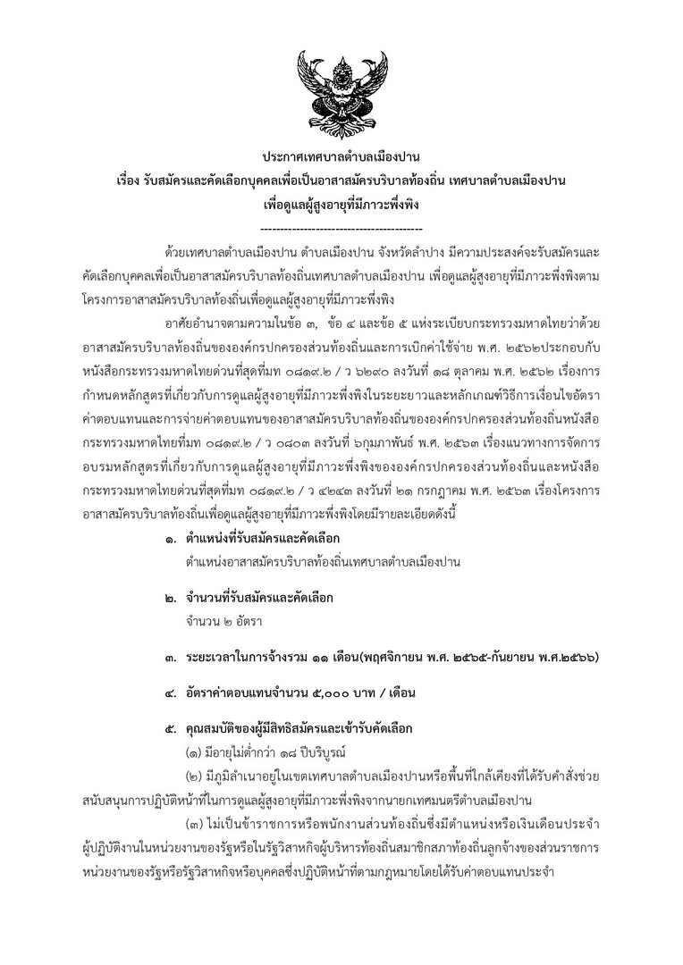 รับสมัครและคัดเลือกบุคคลเพื่อเป็นอาสาสมัครบริบาลท้องถิ่น เทศบาลตำบลเมืองปาน เพื่อดูแลผู้สูงอายุที่มีภาวะพึ่งพิง