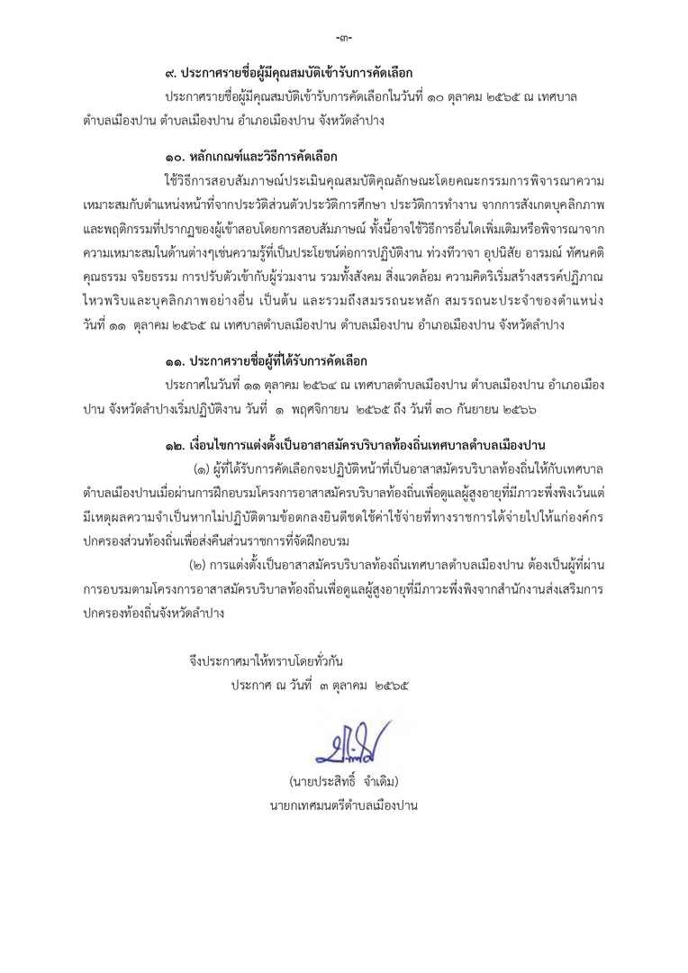 เรื่อง รับสมัครและคัดเลือกบุคคลเพื่อเป็นอาสาสมัครบริบาลท้องถิ่น เทศบาลตำบลเมืองปาน เพื่อดูแลผู้สูงอายุที่มีภาวะพึ่งพิง