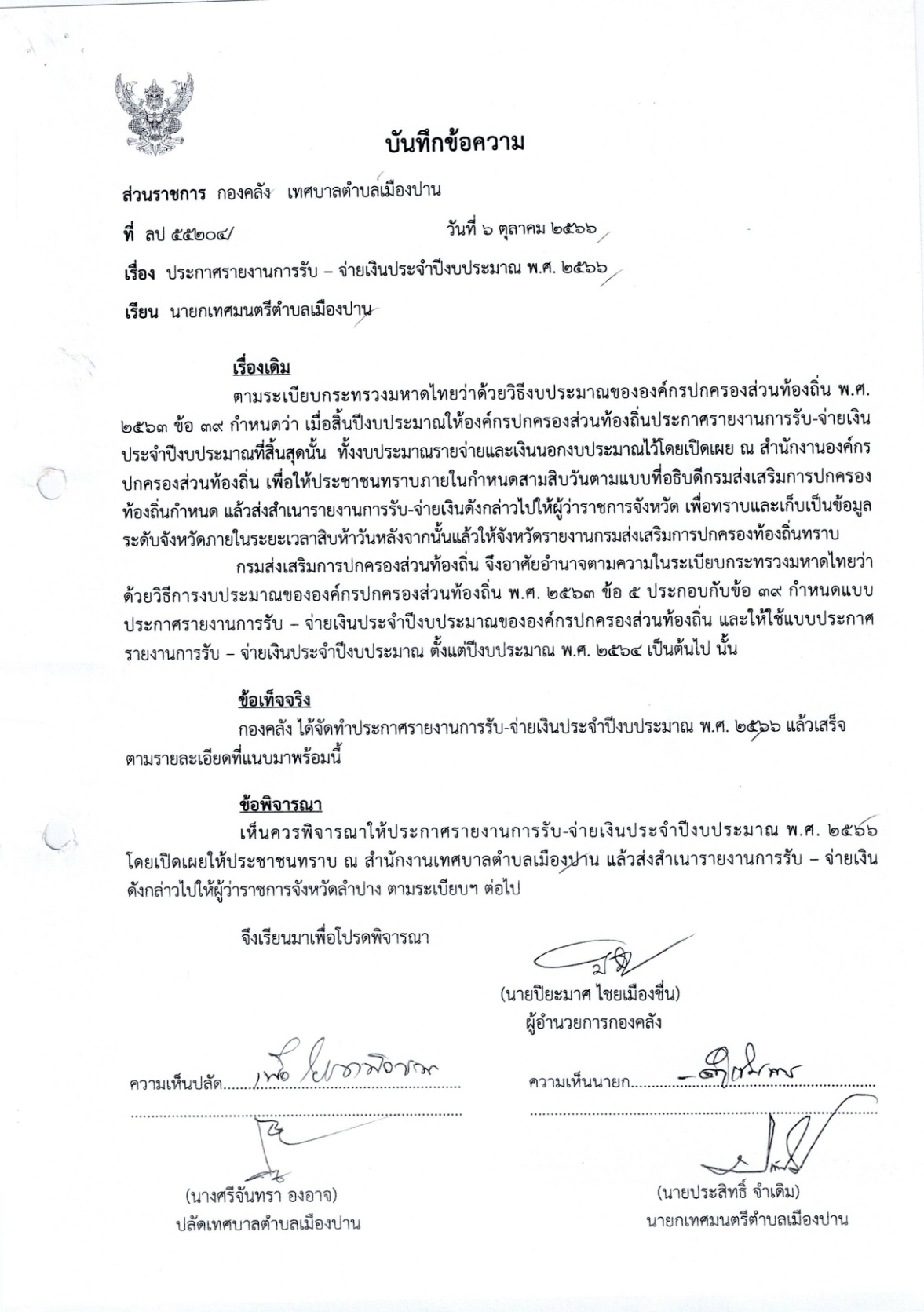 ประกาศรายงานการรับ-จ่ายเงินประจำปีงบประมาณ 2566