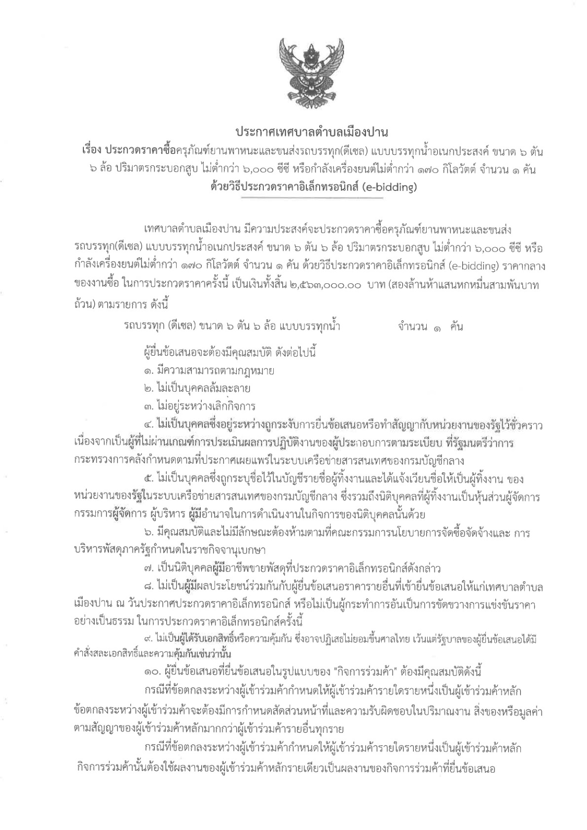 ประกาศเทศบาลตำบลเมืองปาน เรื่อง ประกวดราคาซื้อครุภัณฑ์ยานพาหนะและขนส่งรถบรรทุก(ดีเซล) แบบบรรทุกน้ำอเนกประสงค์ ขนาด ๖ ตัน ๖ ล้อ ปริมาตรกระบอกสูบ ไม่ต่ำกว่า ๖,000 ซีซี หรือกำลังเครื่องยนต์ไม่ต่ำกว่า ๑๗o กิโลวัตต์ จำนวน ๑ คัน