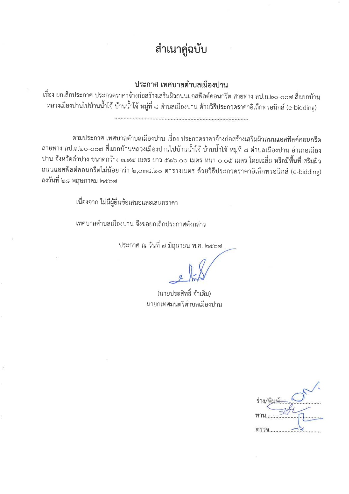 ยกเลิก ประกาศ ประกวดราคาจ้างก่อสร้างเสริมผิวถนนแอสฟัลต์คอนกรีต สายทาง ลป.ถ.20-007 สี่แยกบ้านหลวงเมืองปานไปบ้านน้ำโจ้ หมู่ที่ 8